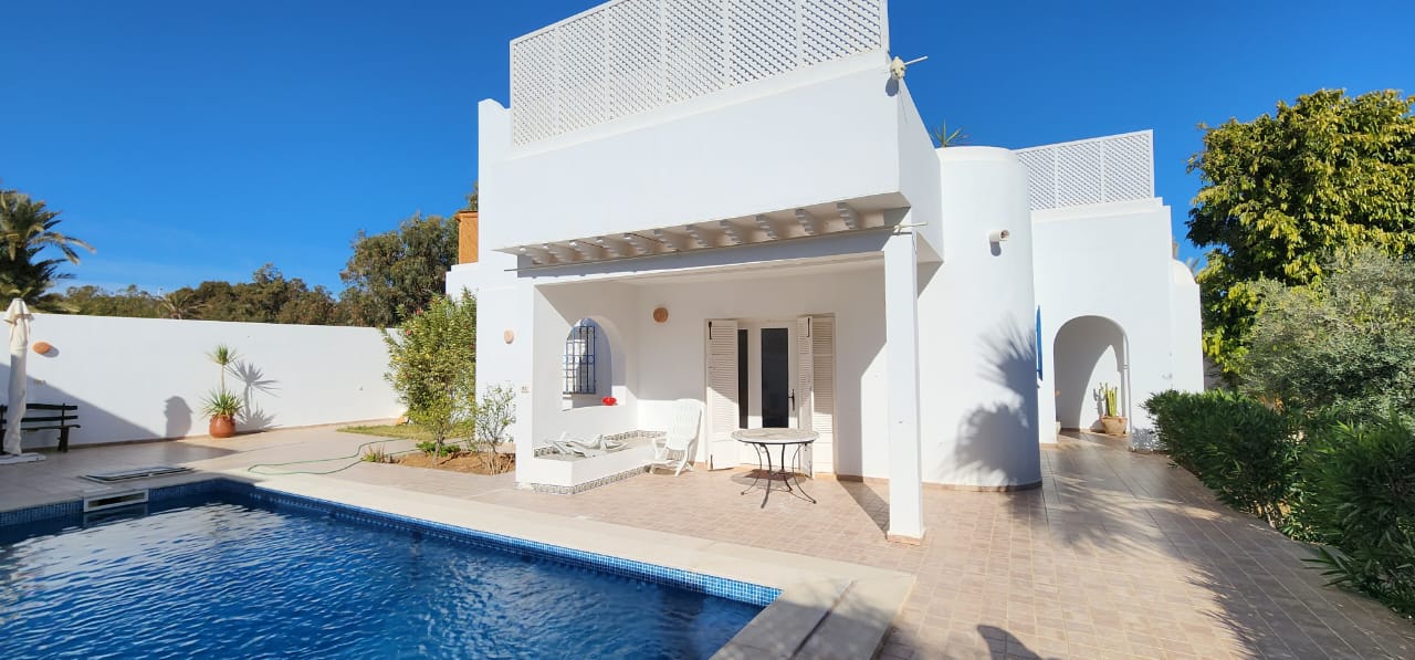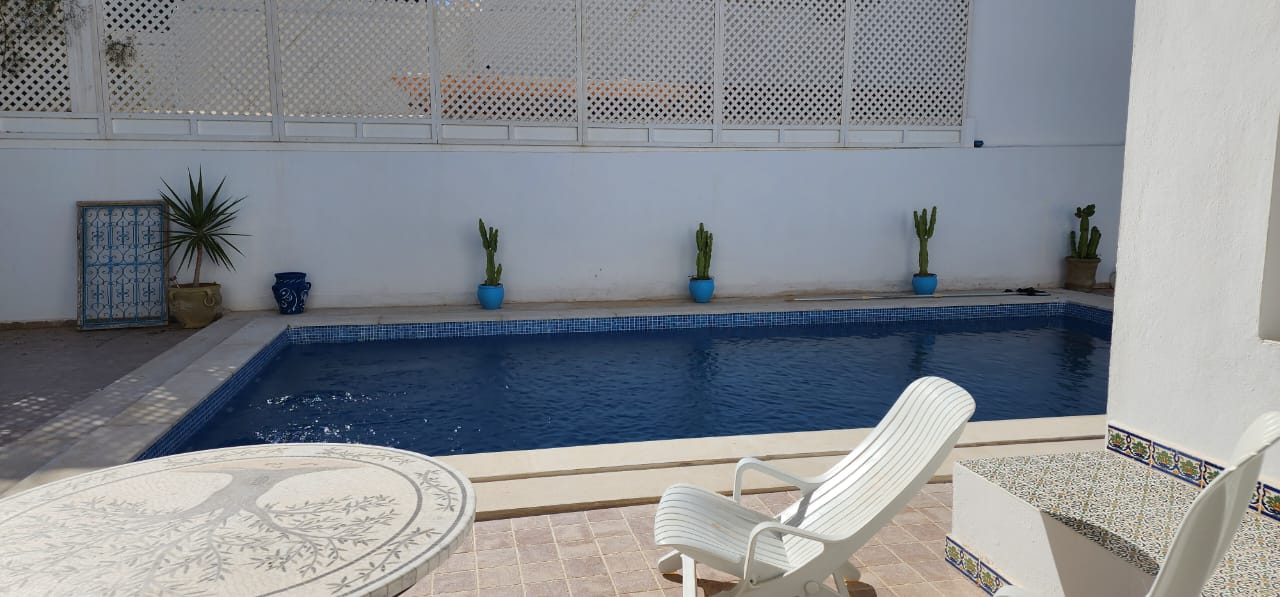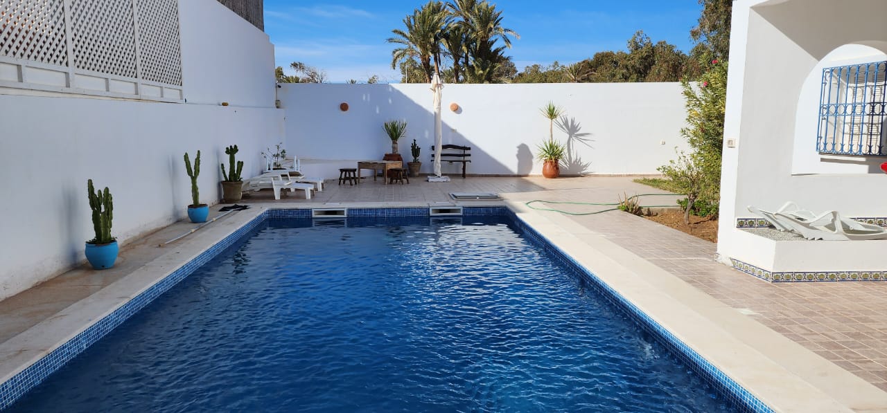 Location De Vacances Magnifique villa à louer pour les vacances à Tezdaine Djerba.Elle dispose 3 chambres à coucher , deux salles d’eaux , cuisine ,salon et une piscine privée.